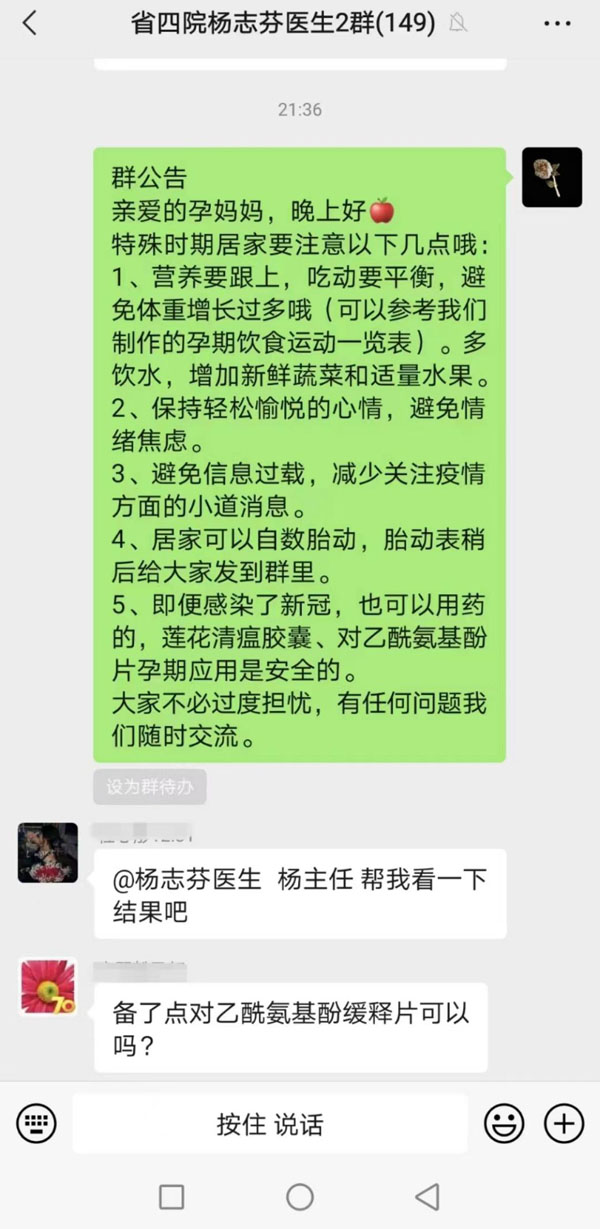 随着疫情防控形势的变化,产科迅速调整门诊及住院就诊流程,保证危重症及急危重症孕产妇生命安全。本部病房、产房迅速划分两区有效保证了病人住院后迅速进入治疗。同时,东院产科通过调研发现,有孕妇的家庭存在较大的顾虑。这些担忧一方面是孕产妇该如何做好健康防护,另一方面则是母婴安全是否会受到威胁。为缓解孕妈妈们的不安和焦虑情绪,帮助孕产妇顺利度过孕期,杨志芬副主任组织科室医护人员,成立了线上咨询小组,通过微信群规范开展咨询和健康教育,内容包括向孕产妇科普孕期新冠相关知识、特殊时期的饮食运动指导、心理疏导以及门诊预约工作等。在微信群,还通过每日打卡的形式督促孕产妇合理饮食、适当运动,助力其平稳度过孕产期。通过线上线下相结合的方式,东院产科让特殊时期的诊疗更接地气,更有温度。此外,东院产科严格按照医院的疫情防控部署安排,全力配合完成病区的搬迁和病室改造。