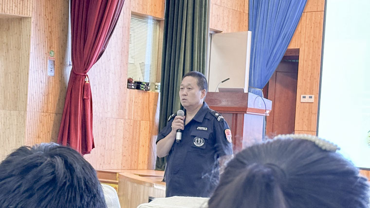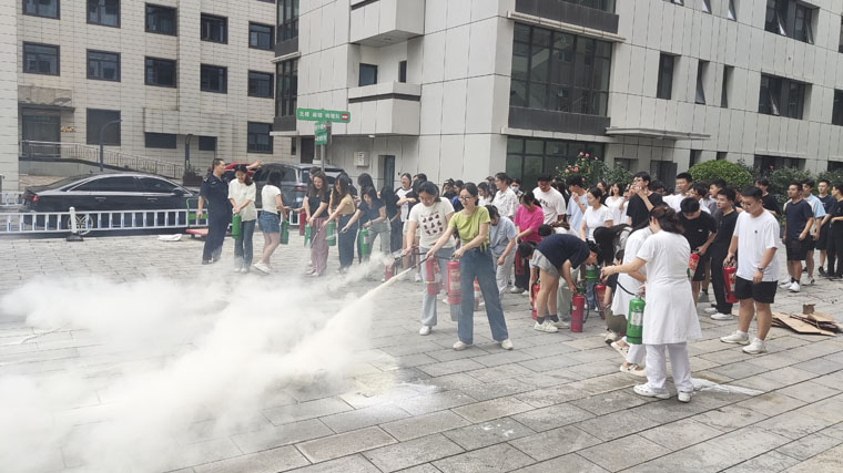 东院保卫处吕冬霜和本部保卫处王海兵,为同学们带来消防知识培训,现场演示了灭火器、消防水带等各类消防设施的使用方法,现场模拟火灾进行疏散演练,每位同学都拿起灭火器实地体验了灭火操作,较熟练地掌握了“提、拔、握、压”的操作流程。