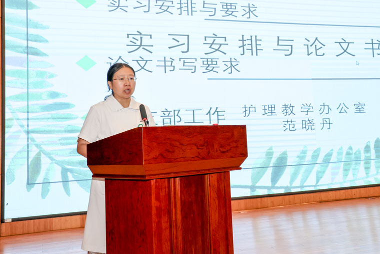 护理教学办公室副主任范晓丹和班主任吴景梅、李慧娟分别从实习安排、毕业论文撰写、学生管理、实验室管理等方面的内容和要求进行了说明。