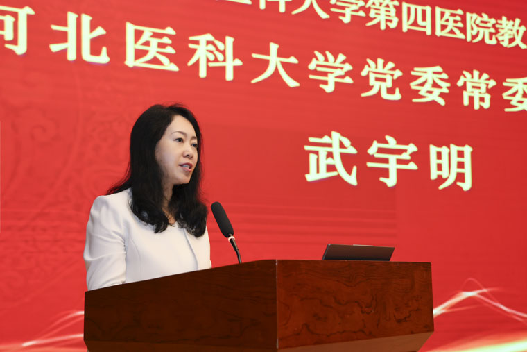 学校党委副书记武宇明代表学校党委,向受到表彰的教师先进集体和个人致以热烈的祝贺。当前是国家“十四五”规划收官之年和“十五五”规划谋篇布局之年、是教育强国建设全面布局、高位推进之年,也是学校全面深化综合改革、全力推进学校高质量发展的关键之年,她对全院教师提出三点希望:一做胸怀“国之大者”的强国之师,传承医学精神,培育卓越医学人才,为教育强国、健康中国建设作出医大贡献;二做矢志躬耕教坛的强教之师,持续学习、创新教学,培养学生解决实际问题的能力,成为学生求知的引路人;三做笃志传承薪火的强校之师,不断提升医院的核心竞争力和社会影响力,加强师资建设,夯实医院与学校长远发展的人才基础。