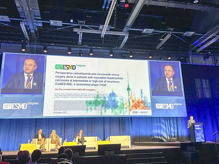 近日,由复旦大学附属中山医院樊嘉院士指导、周俭教授牵头,我院作为重要分中心参与的大型国际多中心临床研究CARES-009成果在2025年欧洲肿瘤内科学会(ESMO)年会上重磅发布,我院副院长彭利教授团队受邀以线上形式全程参与ESMO年会的数据发布仪式,研究结果同步在线发表于国际顶级医学期刊《柳叶刀》(The Lancet)。该研究是全球首个在肝癌围手术期Ⅲ期临床试验中取得阳性结果的突破性研究,标志着肝癌治疗正式迈入“慢病化管理”与“追求治愈”的新时代,充分彰显我院临床科研实力,获得国际同行高度认可。