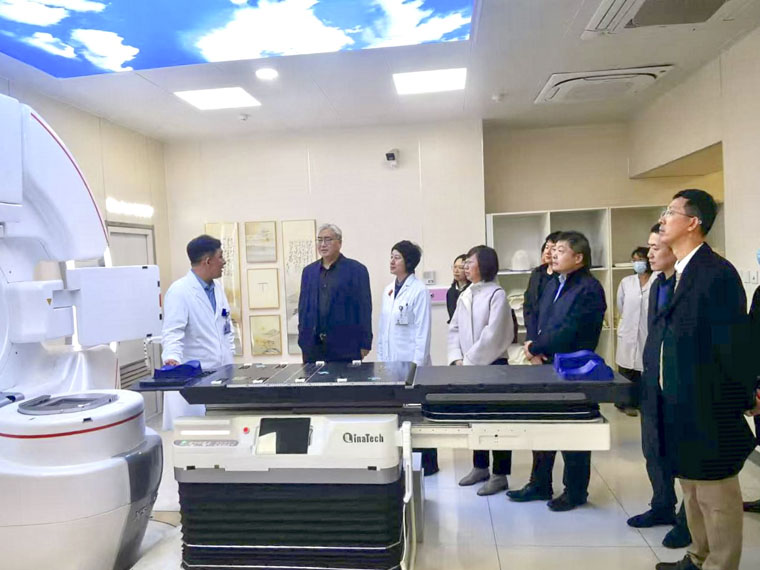 专家团由山东省肿瘤医院副院长邢力刚带队,成员包括放疗病区大科主任兼腹部放疗一病区主任岳金波、放射物理技术科主任尹勇、放射物理技术科副主任朱健、资产管理与经济运营部主任卢洁、医学装备部工程师赵彦富等6位肿瘤放疗领域的专家学者。我院放疗科主任王军,胸部放疗二病区主任王澜,胸部放疗五病区主任周志国,放疗技术组主任迟子锋、副主任张若辉、技师长苗明昌、物理室组长尚凯等全程陪同参观交流。